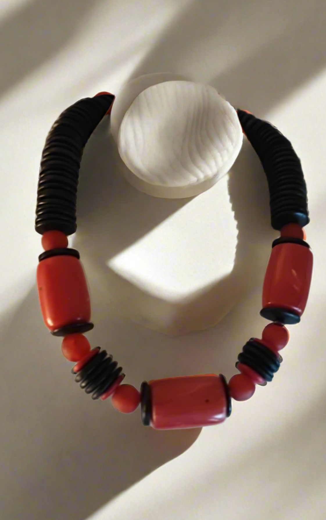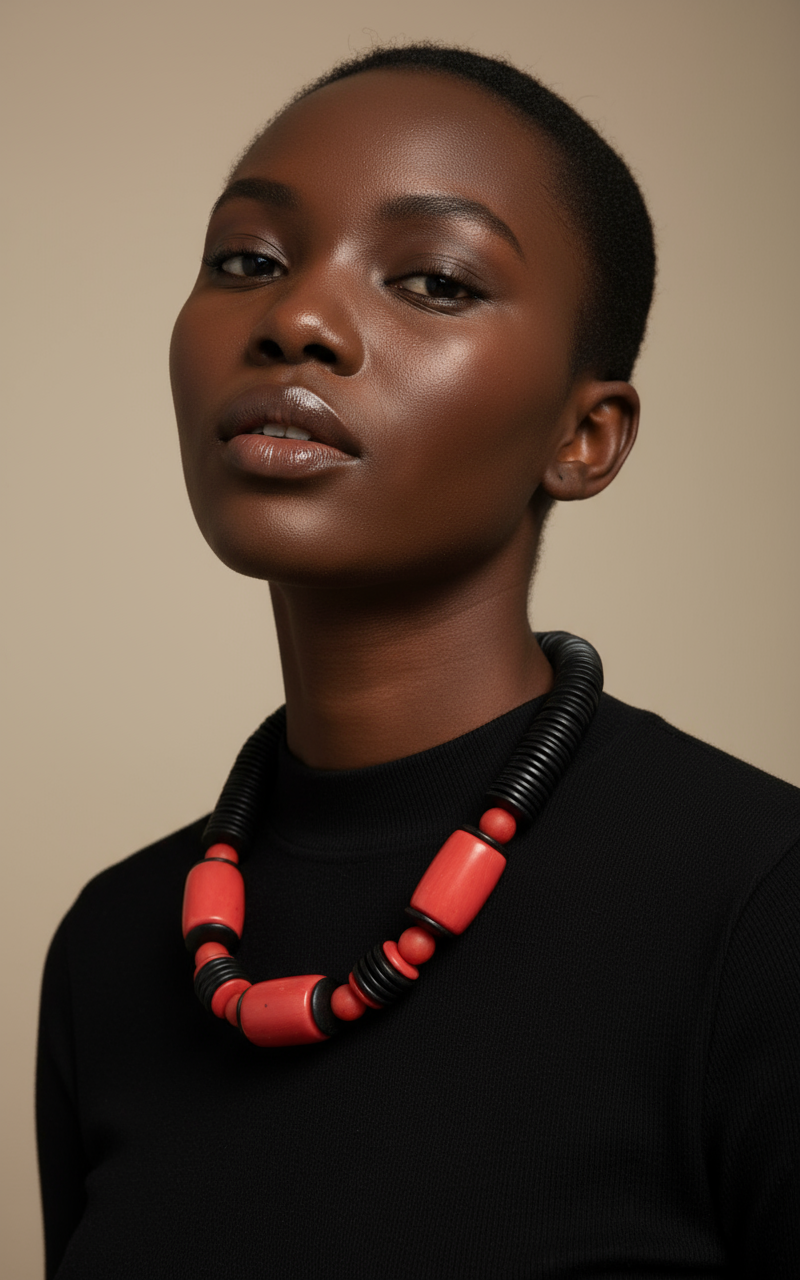 Los barriles rojos de la gargantilla ajustable están hechos con resina y laminas de hueso plano negras. Esta combinación asegura una durabilidad y resistencia inmejorables para una joyería con estilo moderno.