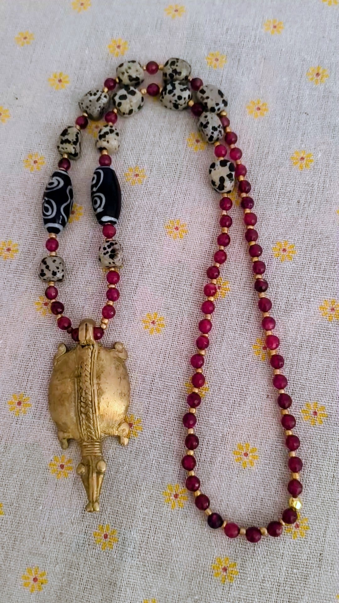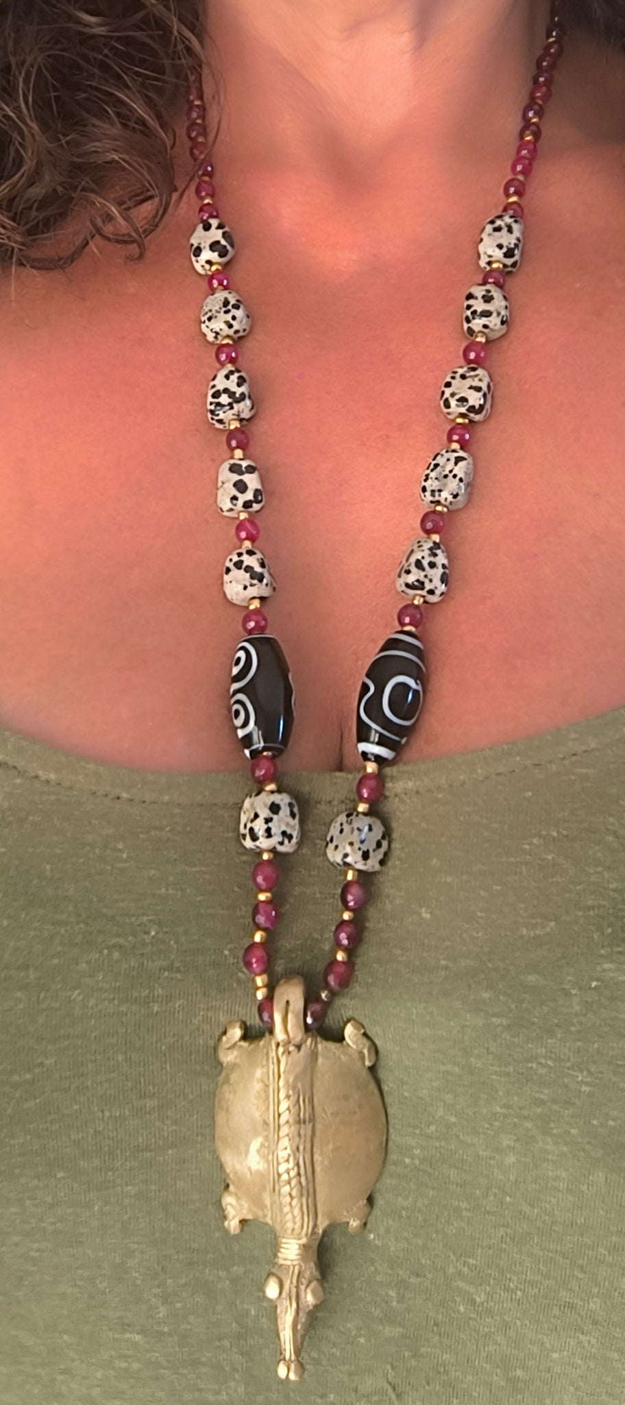Este collar es una mezcla única entre la elegante tortuga africana y la atrevida dalmatita. Hecho a mano con materiales de alta calidad, añade un toque de exotismo y diversión a cualquier atuendo. ¡Perfecto para aquellos que buscan un estilo único y original!