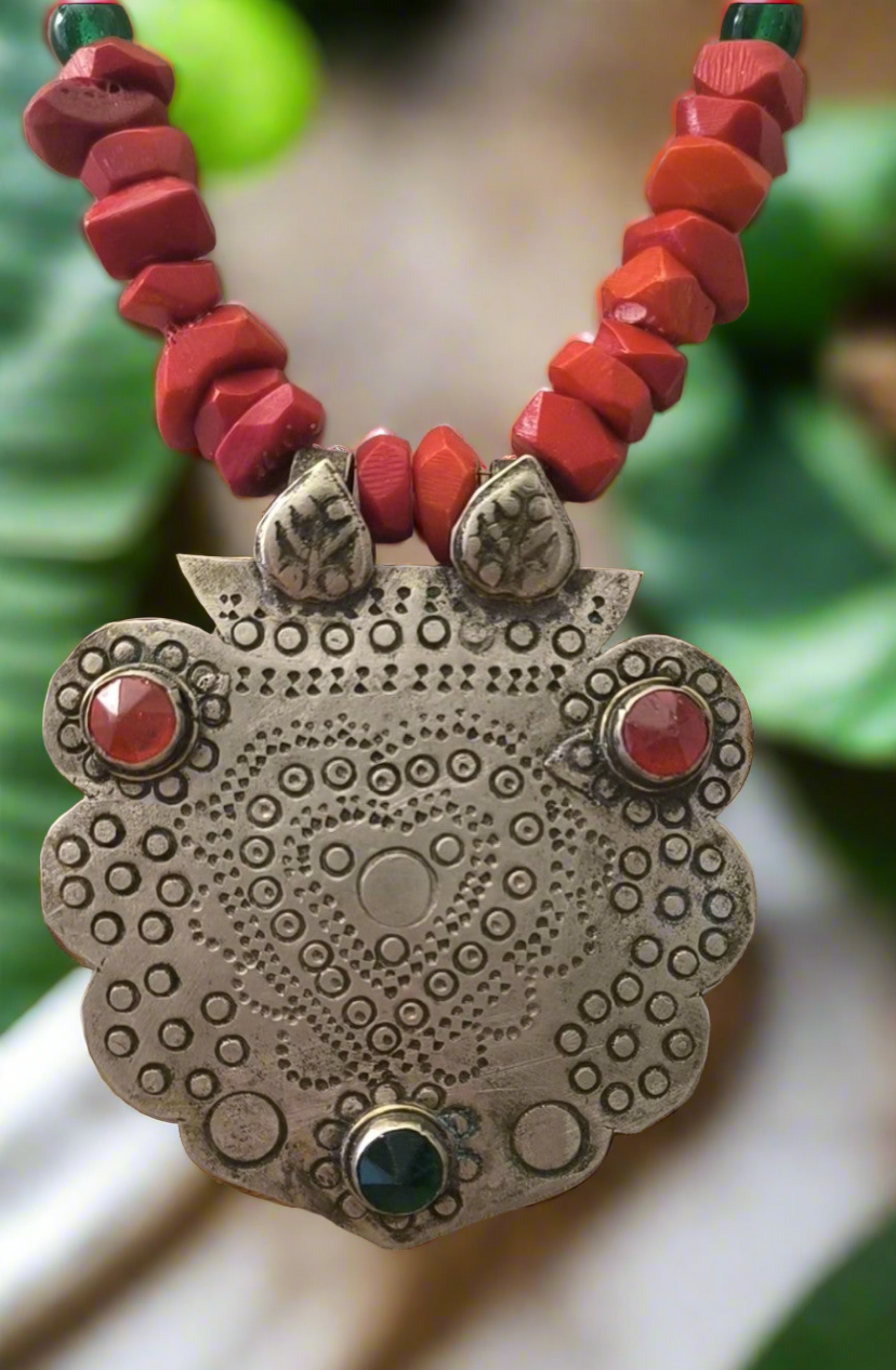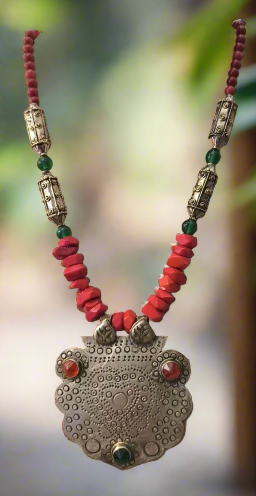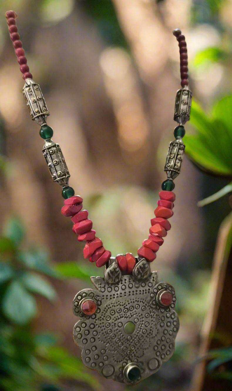 Hecho a mano en Afganistán, este collar es una pieza única con su pieza central de plata alemana y colgante de hueso rojo teñido. Acentúa tu estilo con esta joya artesanal, que combina elegancia y originalidad.