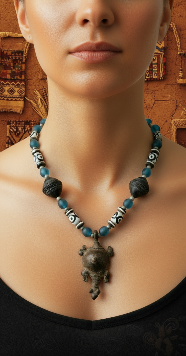 Esta gargantilla presenta una combinación única de un diseño de tortuga negra y krobo azul, elaborado con piezas artesanales africanas. Hecho a mano con atención al detalle, esta pieza es una adición elegante y única a cualquier atuendo. Resalta tu estilo y apoya a artesanos locales con esta hermosa gargantilla.